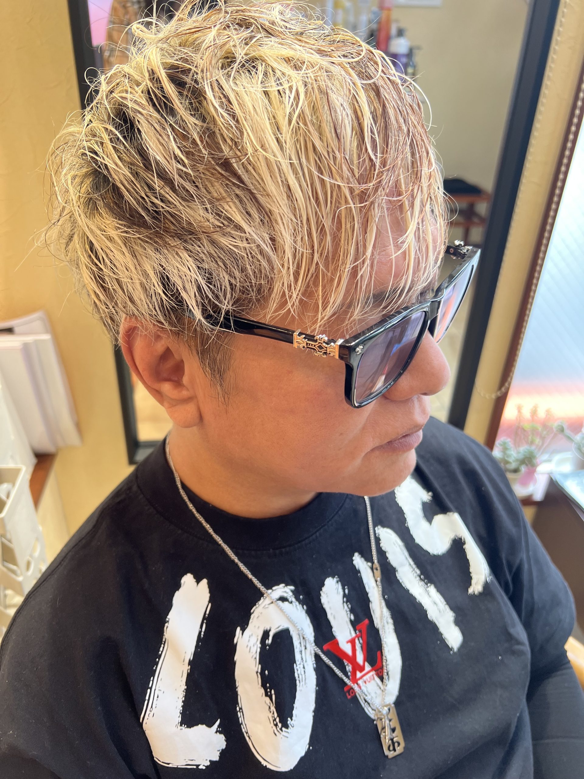 明るいブロンドの細かいメッシュが入ったメンズショートスタイル。トップに束感と動きをつけたカットで、立体感のある質感が特徴。サイドはすっきりし、全体が清潔感のあるビジネス対応デザインに仕上がっている。